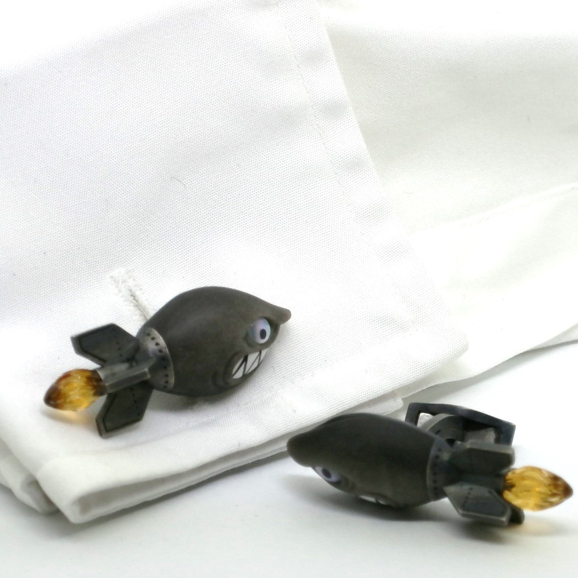 - Modelled shark torpedo cufflinks with grey obsidian body
