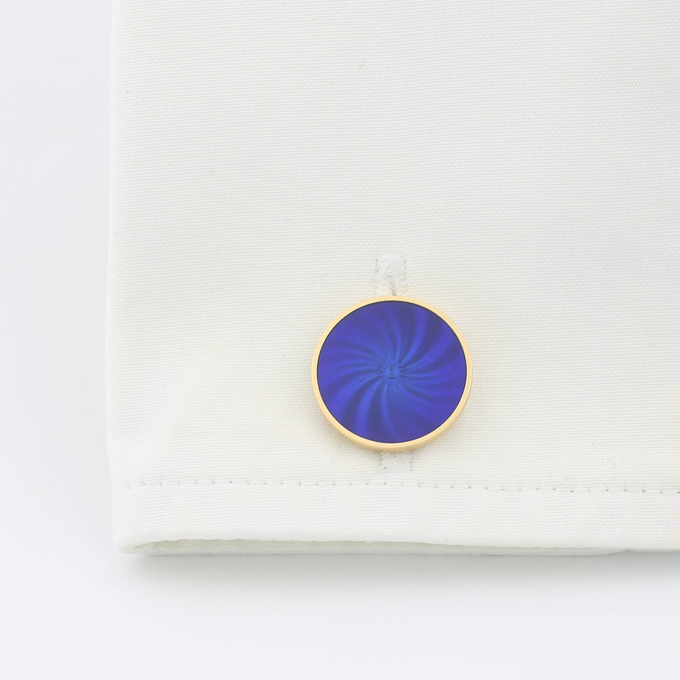 Our hugely popular circular 17mm star swirl design, shown here in vibrant, deep royal blue, works exceptionally well. The engine turned yellow gold brings the vitreous hand layered enamel to life in a range of tones and shades, while the spiral effect comes into its own with the star-detailed centre, providing a truly stellar finish!