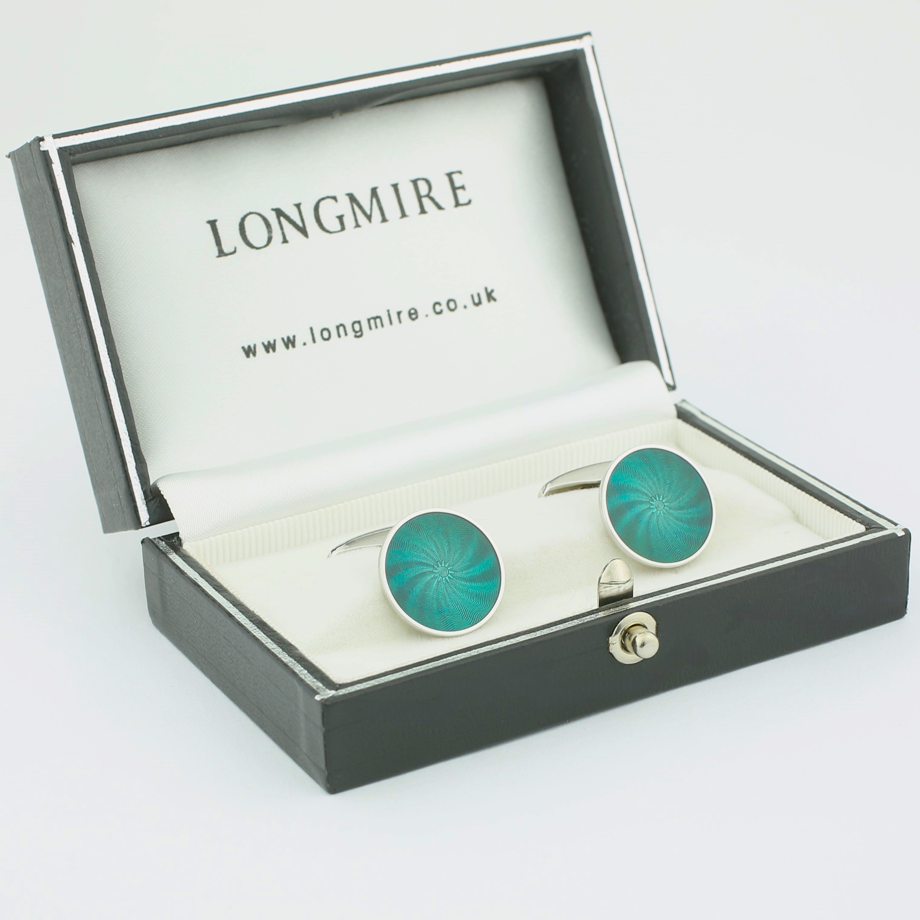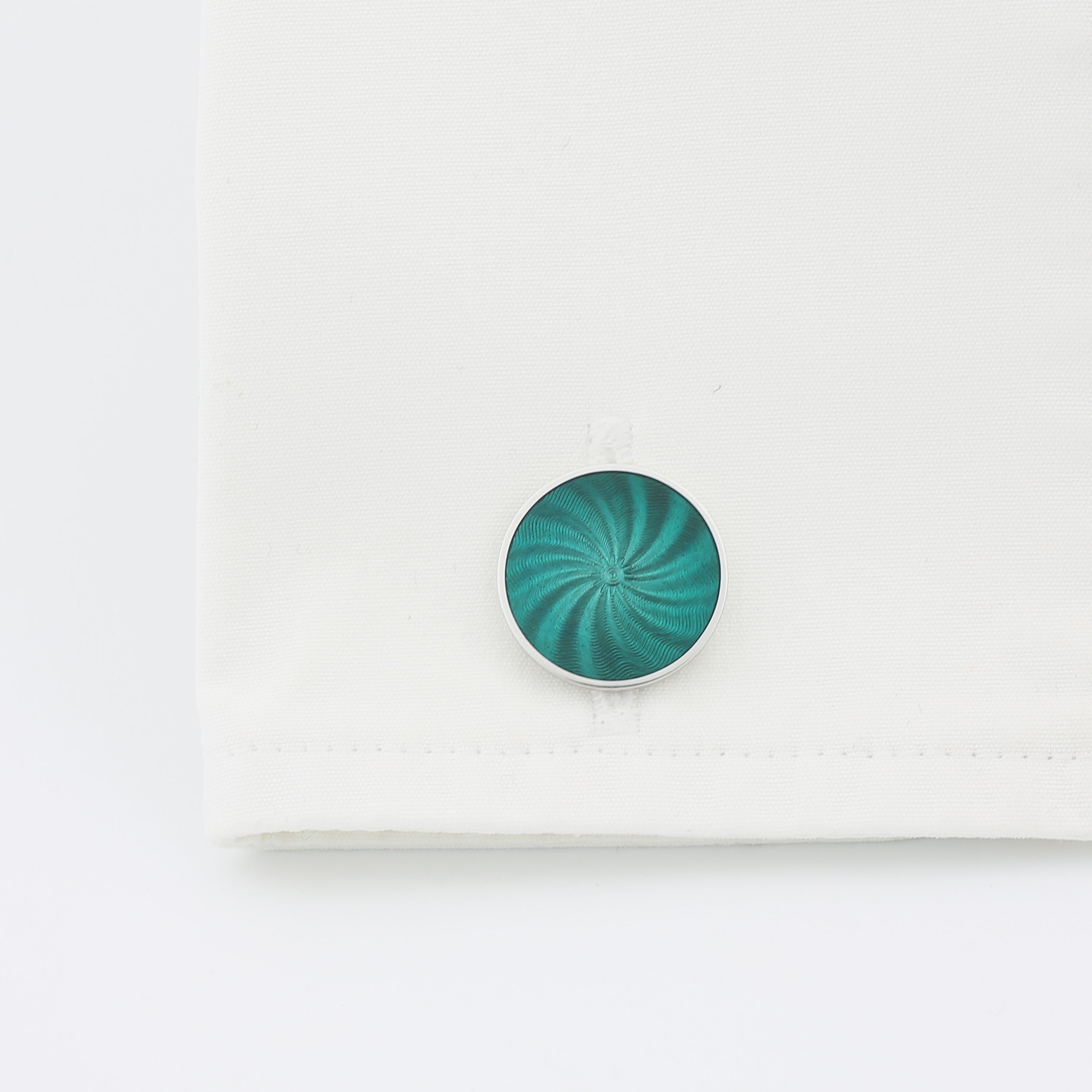 The 17mm Longmire star swirl design is true elegance in cufflink form. This version sees racing green enamelling integrated with the engine-turned solid 18k white gold backing plate to exceptional effect. The enamel is laid down in such a way to allow the spiral pattern to catch the light and shine. There is something special about this deep green enamel framed by the simple white gold border. The star detail at the cufflink’s centre is an eye-catching addition to a highly impressive contemporary piece.